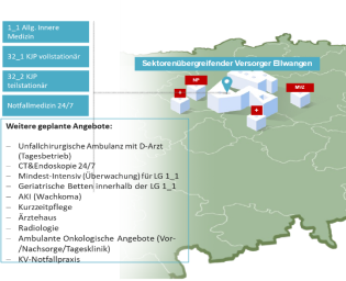Elektiv sollen alle Fächer rund um ein onkologisches Zentrum (Darm, Gyn, Brust, Prostata, Niere, Pankreas, Hämatologie, Kopf) und Psychosomatik dort zentral angesiedelt werden. Eine stationäre onkologische Versorgung an den anderen Standorten ist nicht vorgesehen.