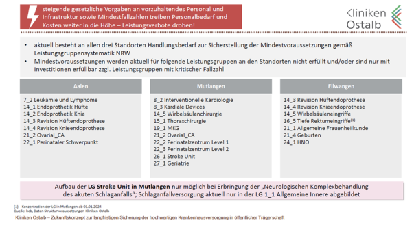 Leistungskonzentration in diesen hochspezialisierten Bereichen ist der einzig zukunftsfähige Weg für die Kliniken Ostalb zur Herstellung einer erforderlichen Marktposition. Dieses Handlungsgebot ist für den Ostalbkreis als großer Vorteil eines vorhandenen Wachstumspotentials zu werten. Ein Abwarten bis zur Fertigstellung und Bezug des Regionalversorgers und der hierdurch möglichen maximalen Konzentration von medizinischen Leistungen ist auf Grund der zu erwartenden Zuweisung von Leistungsgruppen durch das Land (spätestens 2025) ausgeschlossen. Prämisse „Abbau Mehrfachvorhaltung“