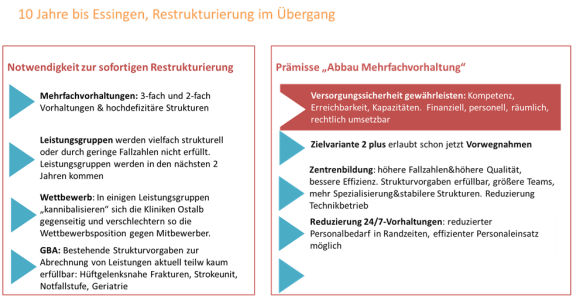 Bei der Entscheidung über strukturelle Maßnahmen, d. h. der Schwerpunktbildung, der konsequenten Zuordnung und damit dem Abbau von Doppel- und Dreifachstrukturen ist zuerst die Versorgungssicherheit und deren Erreichbarkeit sowie ausreichender Kapazitäten zu berücksichtigen und dann zu prüfen, ob sich die Maßnahme umsetzten lässt. Sämtliche Maßnahmen müssen personell, räumlich, rechtlich (Sozialplan, Nachteilsausgleich) möglich sein und müssen in mehreren Etappen umgesetzt werden.