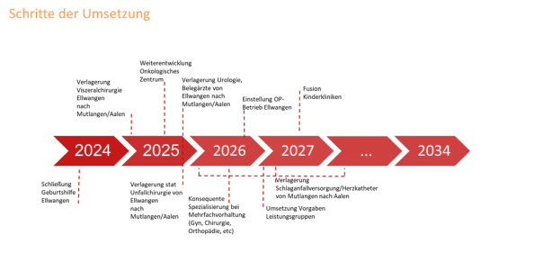 Da die Restrukturierungsmaßnahmen auch stark von baulichen Gegebenheiten abhängen, müssen bis zur Inbetriebnahme des neuen Zentralversorgers insbesondere die zwei bisher großen Häuser Mutlangen und Aalen voll in Betrieb bleiben und in Teilen ergänzt werden (Urologie, Intensiv, Notaufnahme). Der Standort Aalen geht mit Inbetriebnahme des Standortes Essingen vollständig außer Betrieb.