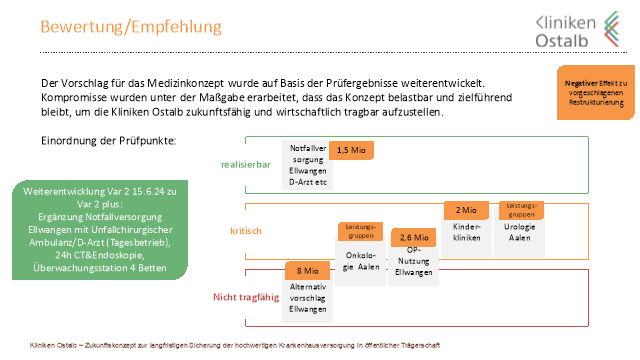 Seit der Einbringung des Vorschlags wurden vom Klinikvorstand sechs Punkte in Bezug auf die Übergangs- und Restrukturierungsmaßnahmen geprüft: Alternativvorschlag Ellwangen, Notfallversorgung Ellwangen, Urologie nach Aalen, Onkologie nach Aalen, Kinderkliniken und OP-Nutzung Ellwangen. Diese Prüfpunkte wurden bewertet und kommen zum Ergebnis, dass die Notfallversorgung in Ellwangen sowohl für das Zielbild als auch im Übergang zum ursprünglichen Vorschlag angepasst werden kann. Die anderen Prüfpunkte wurden als kritisch bis nicht tragfähig bewertet.