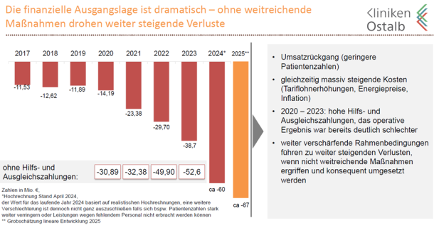 Die finanzielle Situation der Kliniken Ostalb und deren Auswirkungen auf den Kreishaushalt ist dramatisch. Die Restrukturierungs- und Übergangsmaßnahmen dulden keinen Aufschub. Wären die Kliniken Ostalb nicht in der Trägerschaft des Kreises müsste Insolvenz angemeldet werden. Nach aktuellen Prognosen muss mit einem Betriebsdefizit für 2024 von vermutlich - 60 Mio. EUR gerechnet werden. 2023 konnte das Defizit wegen Sondermaßnahmen in Höhe von 14,5 Mio. EUR bei rund - 39 Mio. Euro gehalten werden. Diese Beträge kann der Kreishaushalt nicht mehr abdecken. Eine Erhöhung der Kreisumlage in Höhe von weiteren min. 6 bis max. 12 Punkten würde den Kommunen den finanziellen Spielraum nehmen. Es ist daher notwendig nicht nur betriebliche Effizienz und Abläufe zu steigern, sondern auch strukturelle Maßnahmen einzuleiten. Ziel muss es sein, dass aktuelle Betriebsdefizit um mindestens ein Drittel (ca. 20 Mio. Euro) zu verringern. Dabei geht es nicht um die Haushaltsplanung 2025, sondern um die nächsten acht Jahre, in denen der Kreis jährlich ein Betriebsdefizit der Kliniken Ostalb ausgleichen muss bis der Regionalversorger in Essingen steht. Deshalb müssen Einsparungen im laufenden Betrieb und nötige einmalige Investitionen über den gesamten Abschreibungszeitraum betrachtet werden.
