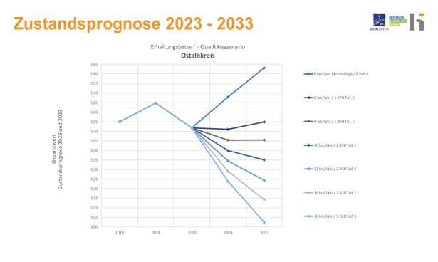 In 2023 wurden insgesamt 475 km Kreisstraßen im Rahmen der Zustandserfassung und -bewertung (ZEB) durch ein Mess- und Erfassungsfahrzeug befahren. Aus den automatisiert aufgenommen Daten wurden über ein standardisiertes Verfahren Zustandswerte für jeden Straßenabschnitt ermittelt und zu einer Zustandsnote für einen gesamten Netzknotenabschnitt aggregiert. Im Vergleich der Zustandserfassungen und -bewertungen der Jahre 2014, 2018 und 2023 hatte sich der Mittelwert der Zustandsnoten zunächst von 3,55 auf 3,64 verschlechtert und nun wieder auf 3,52 verbessert. Diese Verbesserung ist das Ergebnis aus dem Zeitraum 2018 bis 2022, in dem die Sanierungsmittel hinreichend genug zur Verfügung standen. Die reduzierten Haushaltsansätze in der MIFRIFI 2024 - 2028 sind dem finanziellen Haushaltsdefizit des Ostalbkreises geschuldet. Mit dem verminderten Sanierungsumfang wird sich der Zustandswert der Kreisstraßen in den nächsten Jahren spürbar verschlechtern.