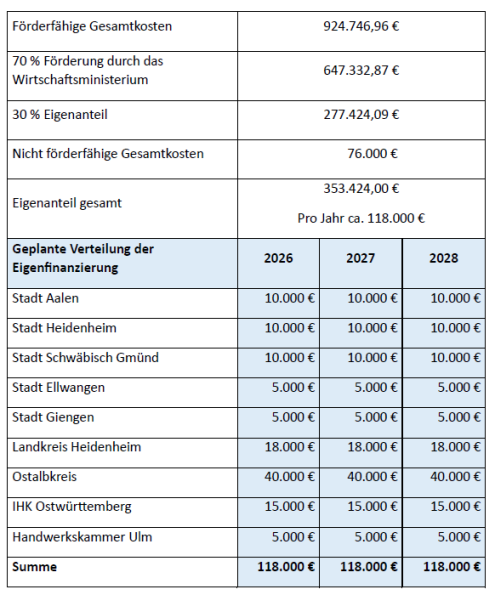 Für die geplante Förderperiode 2026 bis 2028 ist vorgesehen, die Finanzierung des Eigenanteils erneut gemeinschaftlich durch die beteiligten Landkreise, Städte sowie die Kammern zu tragen. Der Ostalbkreis wird in diesem Zusammenhang gebeten, sich mit einem jährlichen Beitrag in Höhe von 40.000 Euro zu beteiligen.