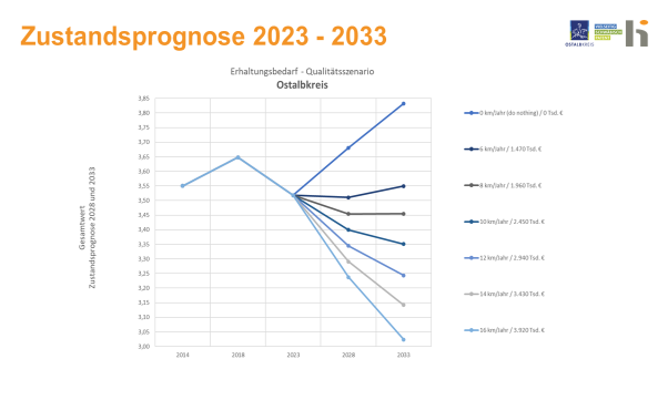 Zustand des Straßennetzes In 2023 wurden insgesamt 475 km Kreisstraßen im Rahmen der Zustandserfassung und Auch in diesem Jahr sind die reduzierten Haushaltsansätze in der MIFRIFI 2025 - 2029 dem finanziellen Haushaltsdefizit des Ostalbkreis geschuldet. Mit dem verminderten Sanierungsumfang wird sich der Zustandswert der Kreisstraßen in den nächsten Jahren spürbar verschlechtern. Für einzelne Jahre sind diese Einschränkungen aufgrund der vorhandenen Substanz vertretbar. Danach sind allerdings höhere Investitionen unumgänglich, damit das Zustandsniveau gehalten werden kann. Verbesserungen erfordern dann weitaus höhere Investitionen. Das folgende Diagramm zeigt die rechnerische Auswirkung von verschiedenen Haushaltsmittelansätzen auf die Gesamtzustandsnote aller Kreisstraßen.