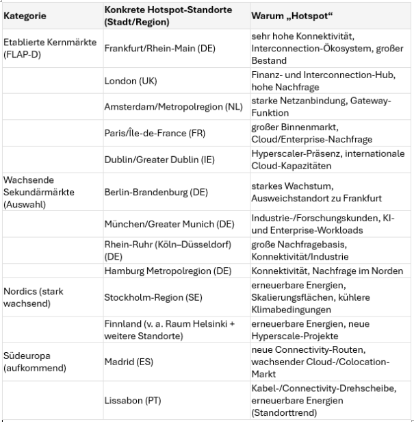 Europa: Die europäische Rechenzentrumslandschaft ist stark durch große Colocation- und Hyperscale-Standorte geprägt, die zusammen den Großteil der IT-Leistung bereitstellen. Klassische Kernräume (häufig entlang großer Internetknoten und Wirtschaftsmetropolen) bleiben wichtig, stoßen jedoch zunehmend an Grenzen bei Netzanschlüssen und Baukapazitäten. Dadurch gewinnen sekundäre Märkte und neue Regionen an Attraktivität, besonders dort, wo erneuerbare Energien, Flächenverfügbarkeit und ein schnellerer Netzausbau zusammenkommen. Als klassische Rechenzentren-Hotspots in Europa gelten vor allem die FLAP-D-Märkte sowie einige stark wachsende Sekundärstandorte:
