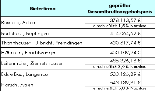 Die Firmen Bortolazzi Bopfingen und Leitenmaier, Ziemetshausen haben Nebenangebote eingereicht. Die Angebotsendsummen der Nebenangebote liegen jedoch weiterhin über der Angebotssumme der Firma Rossaro.
