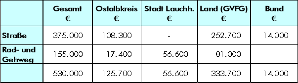 Die Gesamtkosten betragen nach dem Kostenvoranschlag des Straßenbauamtes Ellwangen vom 29.04.2004 insgesamt 530.000 €.